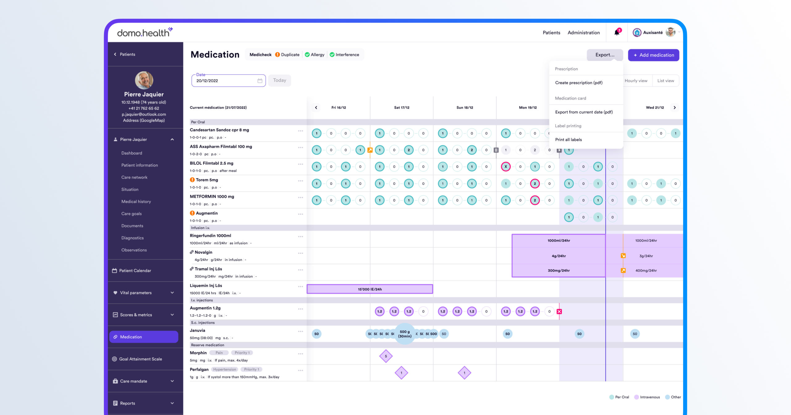 Gestion simple et complexe des prescriptions, détection automatisée des interactions médicamenteuses, interopérabilité avec les standards suisses (ex : semainier, perfusion à domicile).