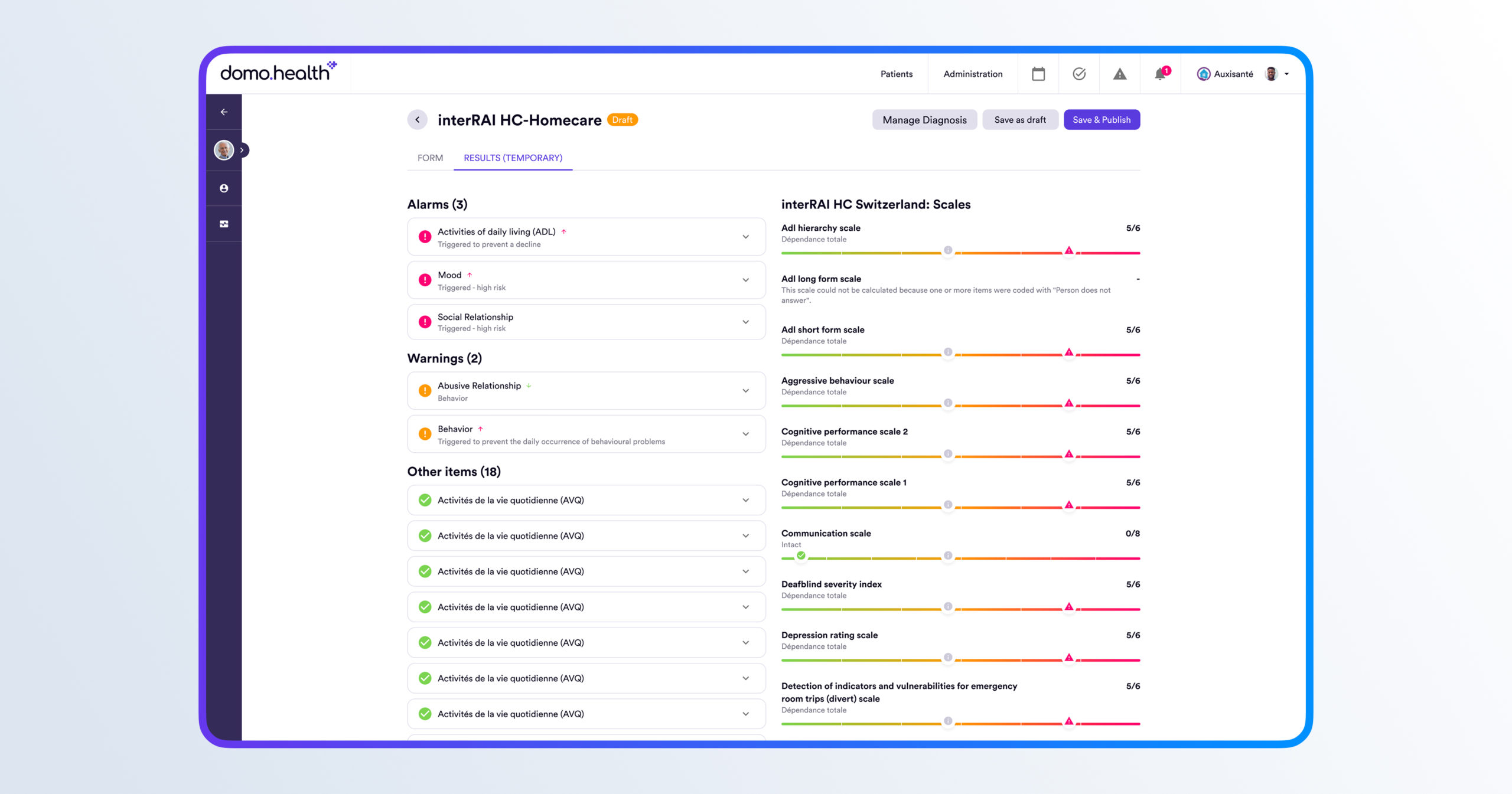 Outils standardisés HomeCare/Mental Health pour le suivi des besoins en soins à domicile.