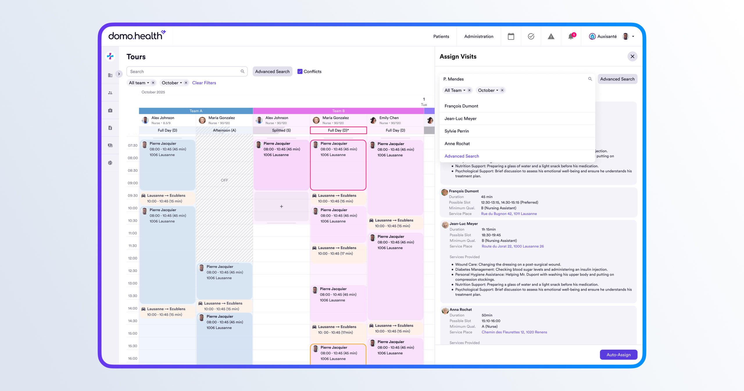 - Plateforme Web (médecins/professionnels des soins à domicile ou soignants) : gestion globale centralisée, suivi temps réel, automatisation, collaboration, IA générative, facturation automatisée.