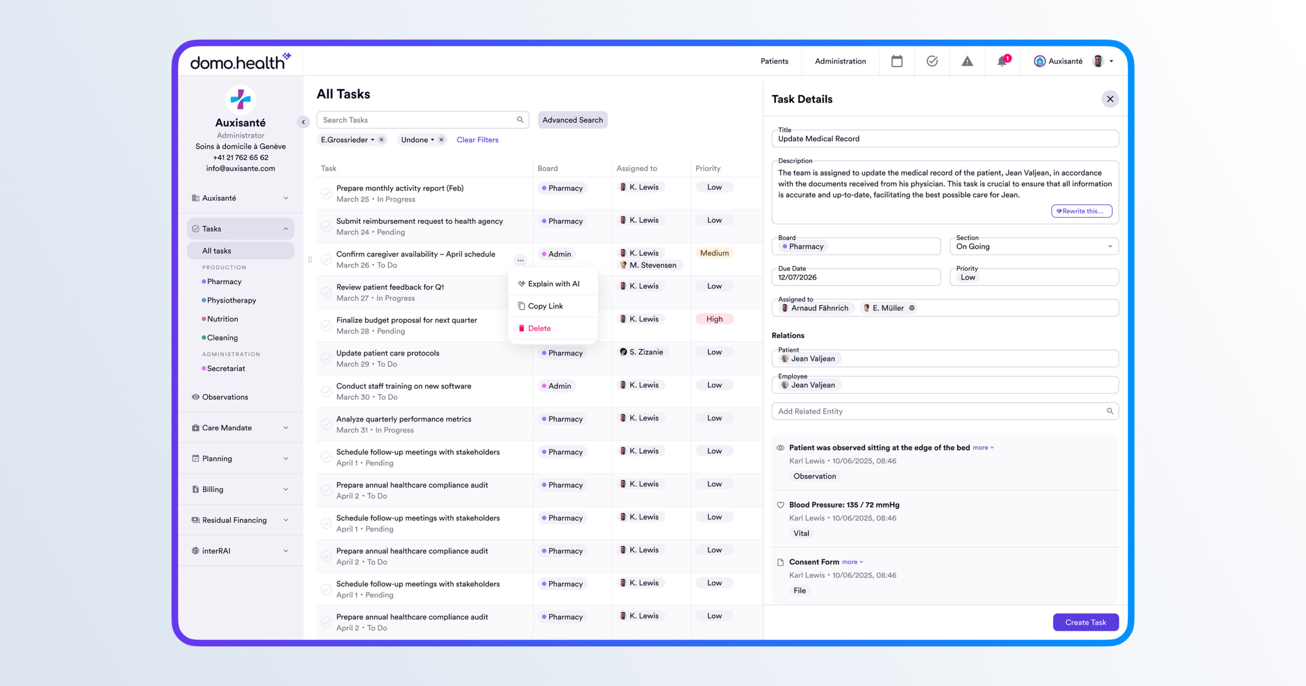 - Application soignants et proches aidants : accès mobile, suivi des soins, alertes, saisie rapide, IA générative (prise de note, génération de rapports etc.).