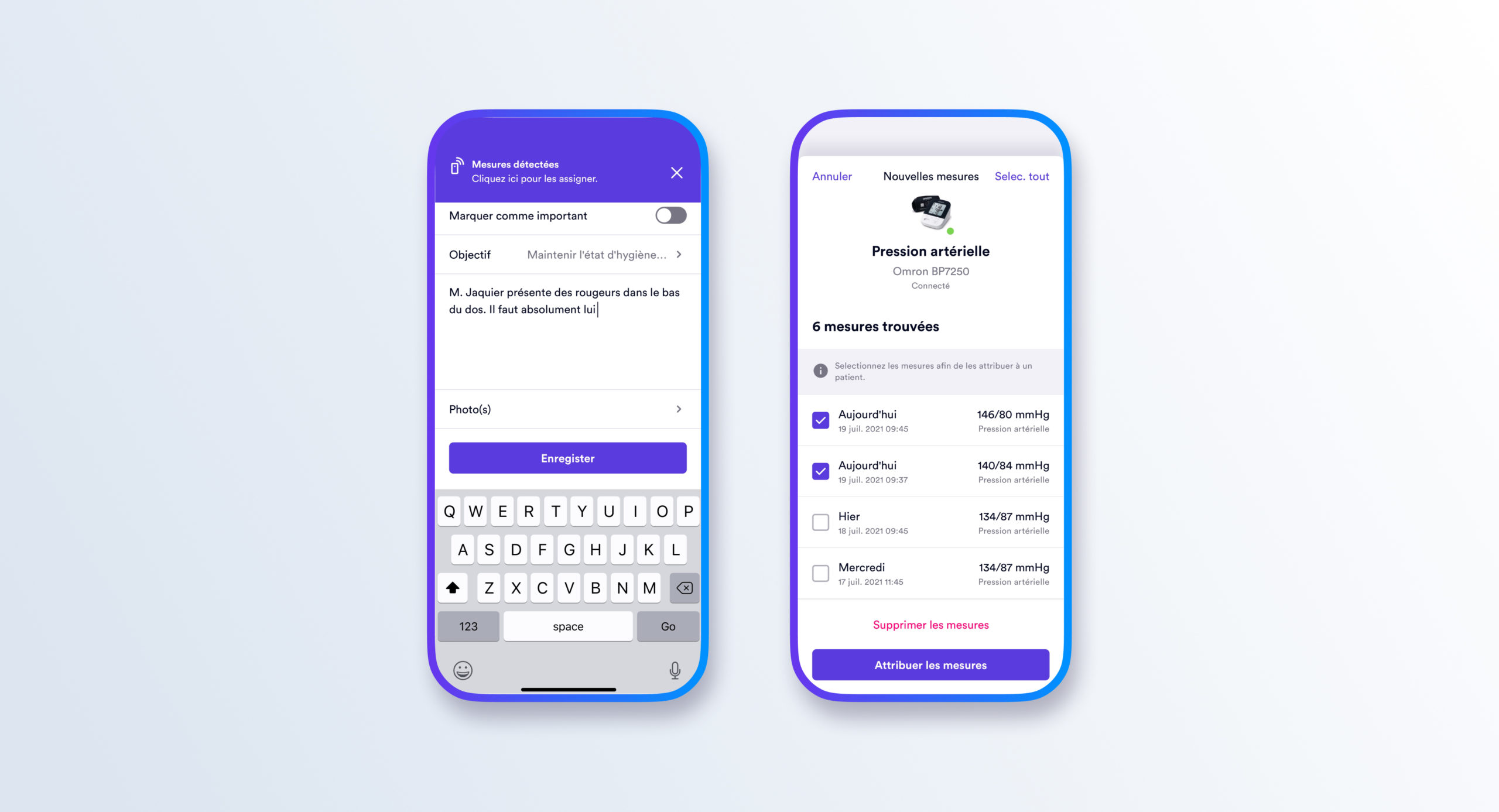 Collecte automatique des données de santé (tension, fréquence cardiaque, etc.) via dispositifs médicaux compatibles.